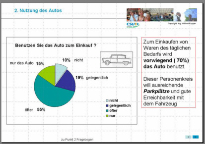 werden. Die Ergebnisse einer vom OV-West im Herbst 2005 durchgeführten Fragenbogenaktion über das Kaufverhalten, die Anforderungen an Qualität und Sauberkeit, Parkmöglichkeiten und vieles mehr wurden ausgewertet und am 5. April 2006 um 19.30 im Bürgertreff „Die Scheune“ von den Initiatoren Ursula Rath und Wilfred Kopper präsentiert. Die Bürger „In der Reuth“ wünschen sich zwar einen Tante-Emma-Laden, haben aber Verständnis, dass man nach drei gescheiterten Versuchen wohl einen solchen nicht mehr erwarten kann. Die Reuther benutzen daher fast nur das Auto, wenn sie einkaufen. Im Westen nehmen übrigens nur 3% ausschließlich das Fahrrad zum Einkaufen und nur 1% fahren mit dem Bus, um Waren des täglichen Bedarfes zu besorgen. Die Bewohner des „Neubaugebietes“ im Westen vermissen eine Apotheke, einen Frischemarkt, eine Postfiliale und ein Ärztehaus, um die wichtigsten Anliegen zu nennen. Nicht nur für die Teilnehmer, sondern speziell auch für Frau Willmann-Hohmann, Leiterin des Planungsamtes der Stadt Erlangen, waren die Erkenntnisse so interessant, dass diese auch für die zukünftige Planung zur weiteren Entwicklung des Baugebietes „Erlangen West“ herangezogen werden sollen.